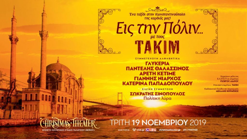 Ένα ταξίδι στην Κωνσταντινούπολη της καρδιάς μας! Εις την Πόλιν.. με τους TAKIM Παραδοσιακά και σύγχρονα τραγούδια με άρωμα Κωνσταντινούπολης Συμμετέχουν αλφαβητικά: ΓΛΥΚΕΡΙΑ ΠΑΝΤΕΛΗΣ ΘΑΛΑΣΣΙΝΟΣ ΑΡΕΤΗ ΚΕΤΙΜΕ ΓΙΑΝΝΗΣ ΝΙΑΡΧΟΣ ΚΑΤΕΡΙΝΑ ΠΑΠΑΔΟΠΟΥΛΟΥ Ειδική συμμετοχή: ΣΩΚΡΑΤΗΣ ΣΙΝΟΠΟΥΛΟΣ: Πολίτικη λύρα Χορεύουν μέλη της Ε.Λ.ΕΤ.Ε.Π (Ελληνική Λαογραφική Εταιρία Έκφρασης και Πολιτισμού) σε